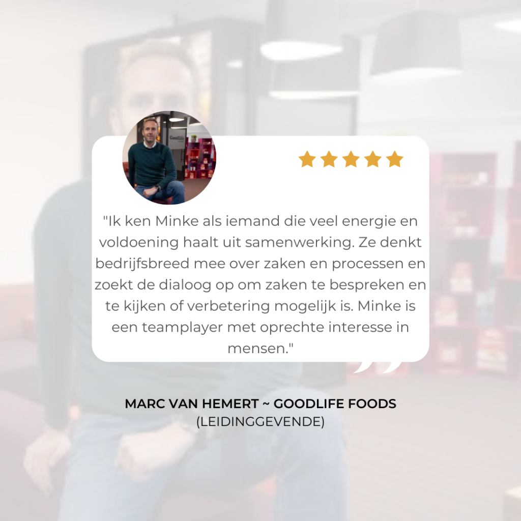 Anderen beschrijven mij als ruimdenkend, georganiseerd, eerlijk, empathisch, trouw, oprecht, enthousiast, een luisterend oor met humor en iemand die scherpe vragen stelt.